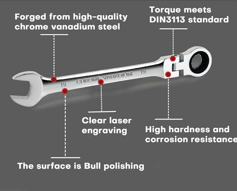Kromad 180° rotation flexibel huvudspärrnyckel är gjord av smidd Cr-v stål med stark hårdhet, mer hållbar och korrosionsbeständig.