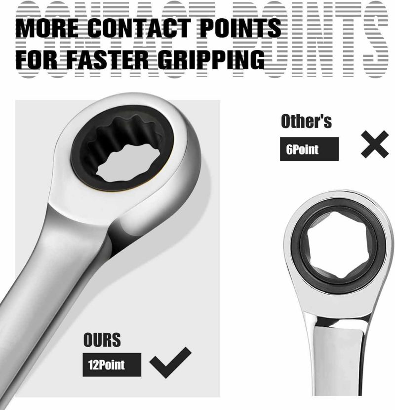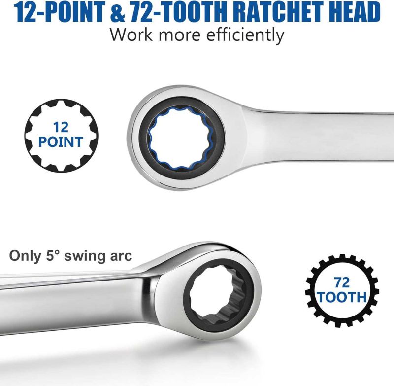 Spärrnyckelsatsen i flera storlekar med 12-punktsändar och 72-tands växeldrift, kräver bara en 5-graders svängbåge för att flytta fästet och påskyndar ditt arbete utan att upprepade gånger lyfta det.